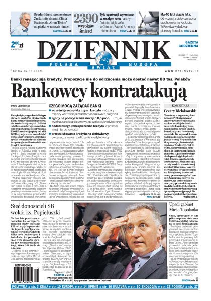 Banki zabrały się do renegocjowania umów kredytowych; Tusk nie poleci na sesję NATO, Kaczyńskiemu zostawia dyplomatyczną grę o stanowisko szefa Paktu; dziś trafia na rynek książka IPN z raportami i nazwiskami donosicieli inwigilujących ks. Popiełuszkę; historycy potwierdzają, że bezpieka wykorzystywała informacje od księdza Jankowskiego; upadł rząd Mirka Topolanka; leczenie chorób związanych z otyłością państwo wydaje rocznie 20 mld zł; świat powoli odchodzi od kary śmierci; notowania prezydenta USA rosną po tym, jak zmusił szefów AIG do oddania premii.