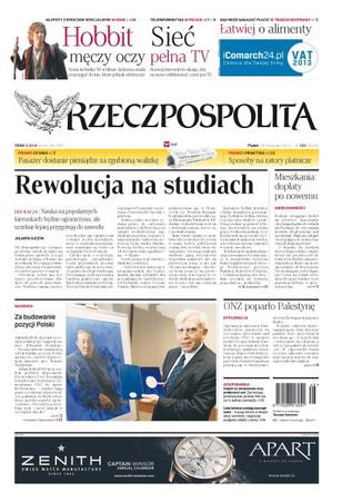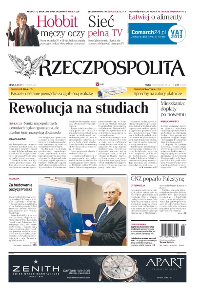 Rewolucja na studiach – nauka na popularnych kierunkach będzie ograniczona, ale uczelnie lepiej przygotują do zawodu; pasażer dostanie pieniądze za zgubioną walizkę; sposoby na zatory płatnicze; ONZ poparło Palestynę; dopłat za złomowanie chcą producenci aut; Hobbit – nowa technika 3D w filmie Jacksona miała przyciągać do kin, może jednak odstręczać.