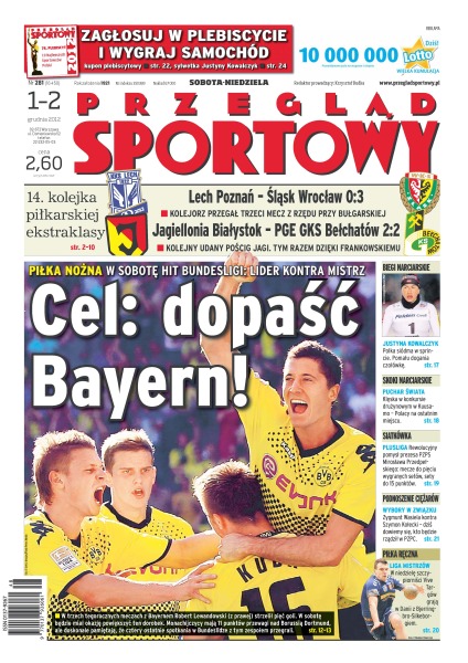 Cel, dopaść Bayern – w sobotę hit Bundesligi – lider kontra mistrz; 14 kolejka piłkarskiej ekstraklasy – Kolejorz przegrał trzeci mecz z rzędu przy Bułgarskiej – Lech Poznań - Śląsk Wrocław 3-0; Jagiellonia Białystok - PGE GKS Bełchatów 2-2 – kolejny udany wyścig Jagi, tym razem dzięki Frankowskiemu; Justyna Kowalczyk siódma w sprincie, pomału dogania czołówkę; klęska w konkursie drużynowym Pucharu Świata w Kuusamo w skokach narciarskich – Polacy na ostatnim miejscu; Zygmunt Wasiela kontra Szymon Kołecki – dziś dowiemy się, kto będzie rządził w PZPC.