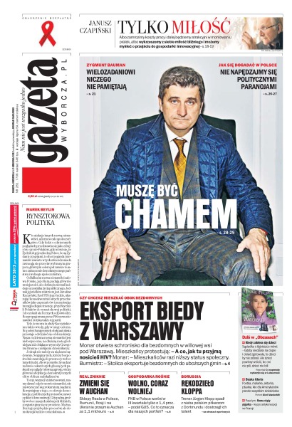 „Muszę być chamem” – Janusz Palikot; eksport biedy z Warszawy – Monar otwiera schronisko dla bezdomnych w willowej wsi pod Warszawą; Real zniknie, zmieni się w Auchan; gospodarka rośnie – wolno, coraz wolniej; rękodzieło Kloppa – trener Juergen Klopp spadł z nieba polskim piłkarzom z Dortmundu i dostrzegł ich talent; nie napędzajmy się politycznymi paranojami – jak się dogadać w Polsce; Putin słabnie, siłowcy nadchodzą – programy informacyjny zmieniły się w kronikę kryminalną z życia sfer najwyższych; silna rodzina Radia Maryja – w sobotę w Toruniu będzie świętować 21. urodziny – w dobrym nastroju, bo stacja ojca Tadeusza Rydzyka ma najwięcej słuchaczy od siedmiu lat.