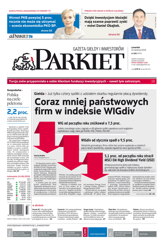 Największy w Polsce newsroom gospodarczy zbiera, analizuje i zgłębia dla Państwa najważniejsze informacje ze świata finansów. Codzienne wydanie „Parkietu”, sześć dni w tygodniu, to kilkadziesiąt artykułów o emitentach, instytucjach finansowych, gospodarce. To również opinie, felietony i wywiady z najważniejszymi ludźmi krajowej i globalnej finansjery.