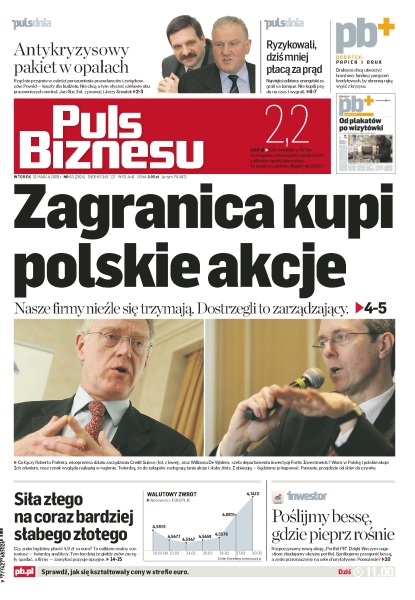 Rząd ma debatować nad pakietem działań antykryzysowych, zaproponowanym przez organizacje pracodawców i związki zawodowe, według zagranicznych analityków warto inwestować na warszawskiej giełdzie, energia jest dziś tańsza niż pod koniec ubiegłego roku, Polbank zawiesza zmiany w umowach, trwa wewnętrzny spór w Millennium o premie za sprzedaż kart kredytowych, rosyjska gospodarka skurczy się w tym roku o 4,5%, słabnie złoty, słabnie GPW.