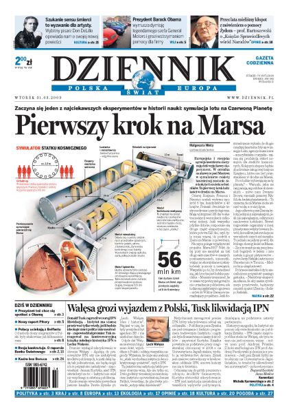 Rozpoczyna się jeden z najciekawszych eksperymentów w historii nauki - symulacja lotu na Marsa; Lech Kaczyński poleci do Pragi i razem z Donaldem Tuskiem weźmie udział w szczycie UE - USA; Lech Wałęsa uważa, że jest bezkarnie atakowany i grozi wyjazdem z Polski na stałe; dlaczego urzędnicy boją się używać służbowych kart kredytowych; gimnazjaliści nie dostaną od rządu obiecanych laptopów; jak mieszkańcy dużych miast spędzają wolny czas; według obliczeń ekspertów, Irlandię czeka pięć lat recesji.