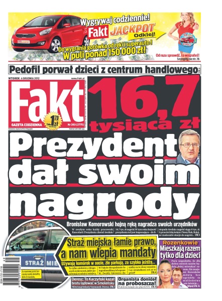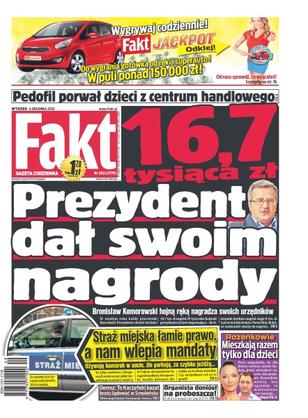 Pedofil porwał dzieci z centrum handlowego; Bronisław Komorowski hojną ręką nagradza swoich urzędników; jak straż miejska łamie przepisy; Małgorzata i Jacek Rozenkowie mieszkają razem tylko ze względu na dzieci; Czarne Koszule nie zostały wiceliderem; lider naszych skoczków narciarskich nie chce słyszeć o zmianie trenera kadry; bezmyślni fani Niebieskich wzniecili pożar na stadionie przy Łazienkowskiej; Mariusz Wach zaprzecza doniesieniom Niemców, że przyjmował niedozwolone środki; po kolejnym zwycięstwie na gali KSW Chalidow zapowiedział, że nadal chce bić się w Polsce; Aleksandr Łukaszenko zabronił pracownikom zwalniać się z pracy.
