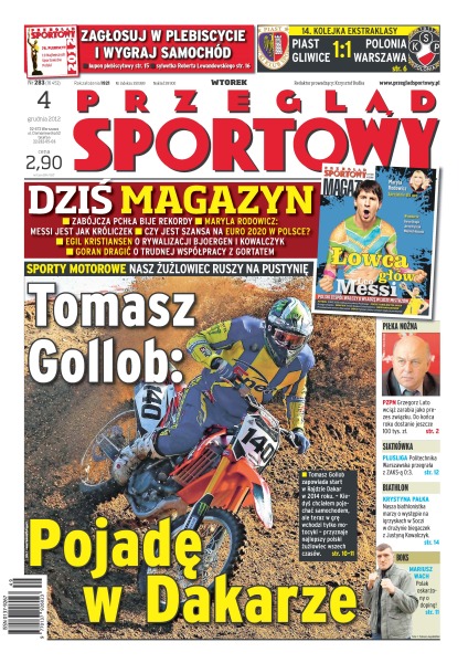 Tomasz Gollob zapowiada start w Rajdzie Dakar w 2014 roku; niedrodzy piłkarze udowodnili, że potrafi ą grać przynajmniej nie gorzej od przepłaconych gwiazd; Anglicy zagrają w Lidze Europy, jeśli pokonają Niemców, a Ajax nie wygra z Realem; Mariusz Wach oskarżony o niedozwolone wspomaganie – przed walką z Władymirem Kliczką miał przyjmować sterydy; po zwycięstwie nad PGE Skrą Bełchatów wszyscy wynosili siatkarzy warszawskiej Politechniki pod niebiosa – wczoraj na ziemię sprowadził ich lider ZAKSA Kędzierzyn-Koźle; Krystyna Pałka marzy o występie w drużynie olimpijskiej ze szkolną koleżanką Justyną Kowalczyk; od dwudziestu lat nie mieliśmy lepszego piłkarza niż Robert Lewandowski.