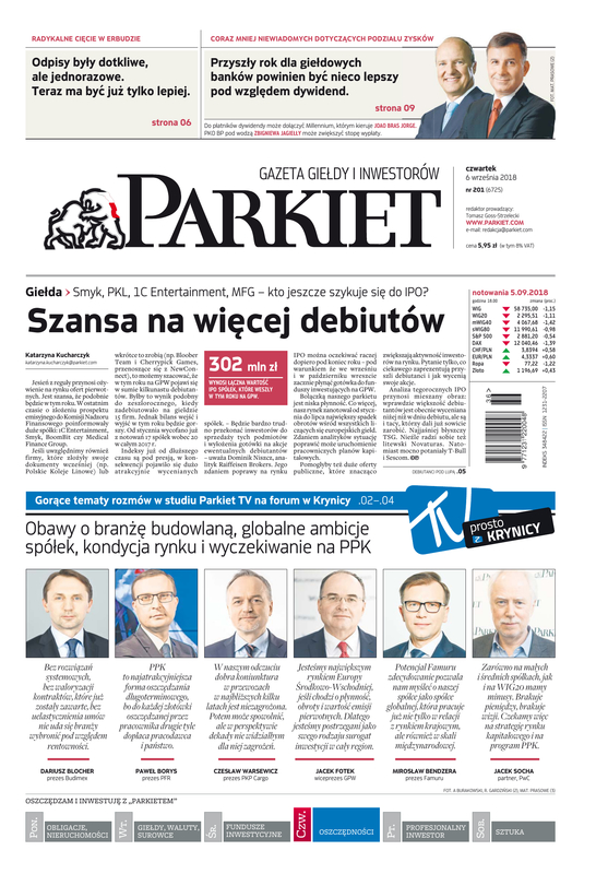 Największy w Polsce newsroom gospodarczy zbiera, analizuje i zgłębia dla Państwa najważniejsze informacje ze świata finansów. Codzienne wydanie „Parkietu”, sześć dni w tygodniu, to kilkadziesiąt artykułów o emitentach, instytucjach finansowych, gospodarce. To również opinie, felietony i wywiady z najważniejszymi ludźmi krajowej i globalnej finansjery.