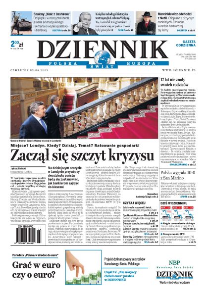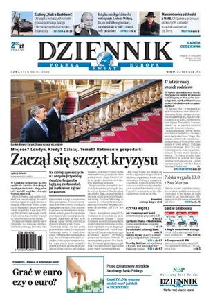 W Londynie rozpoczyna się dziś spotkanie liderów 20 najbogatszych państw świata; lewica żąda odwołania Janusza Kurtyki, a prezydent zapowiada jego odznaczenie; Marcinkiewicz rezygnuje z rady nadzorczej Netii; PiS tworzy fikcyjny rząd na otarcie łez; nie zabraknie krzeseł dla polskiej delegacji na szczycie Unia – Stany Zjednoczone w Pradze; błąd pilota w trakcie bardzo skomplikowanego manewru jest najbardziej prawdopodobną przyczyną wtorkowej katastrofy Bryzy; Olewnik mógł przeszkadzać w praniu brudnych pieniędzy; dziś sąd zdecyduje o odszkodowaniu dla rodzin dzieci podmienionych w szpitalu 25 lat temu; w naszej służbie zdrowia absurd goni absurd; koniec rosyjsko-amerykańskiej zimnej wojny; Beniamin Netanjahu przejął władzę w Izraelu. Dodatki: The Wall Street Journal, Warszawa, Polska w drodze do Euro.