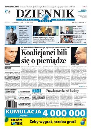 Po dwóch dniach sporów Sejm ograniczył finansowanie partii; Uniwersytet Jagielloński jest zbulwersowany ministerialną kontrolą; dyplomaci boją się, że Buzek nie zostanie szefem europarlamentu; użytkownicy Naszej-klasy zakładają na portalu fałszywe profile ośmieszające prezydenta Lecha Kaczyńskiego; 17 osób usłyszało wyroki w największym procesie korupcyjnym w polskiej piłce;premier Danii Anders Fogh Rasmussen oficjalnie potwierdził, że jest kandydatem na nowego szefa Sojuszu; rozmowa z ojcem dzieci podmienionych w szpitalu. Dodatki: The Wall Street Journal, Warszawa, Magazyn Dziennika, Europa, Podróże.