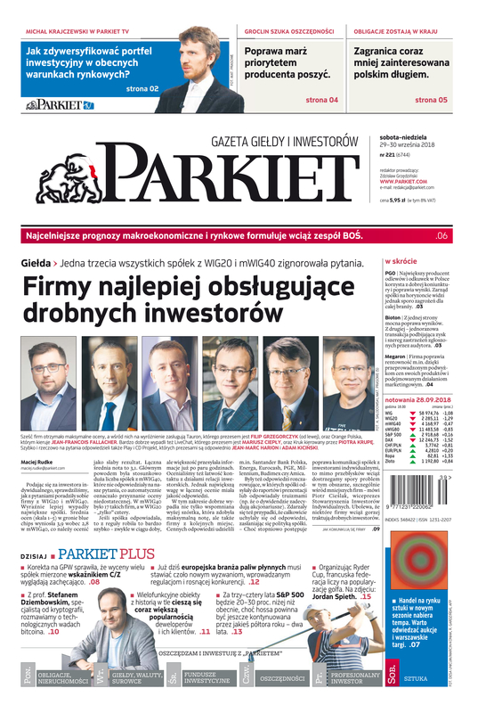 Największy w Polsce newsroom gospodarczy zbiera, analizuje i zgłębia dla Państwa najważniejsze informacje ze świata finansów. Codzienne wydanie „Parkietu”, sześć dni w tygodniu, to kilkadziesiąt artykułów o emitentach, instytucjach finansowych, gospodarce. To również opinie, felietony i wywiady z najważniejszymi ludźmi krajowej i globalnej finansjery.
