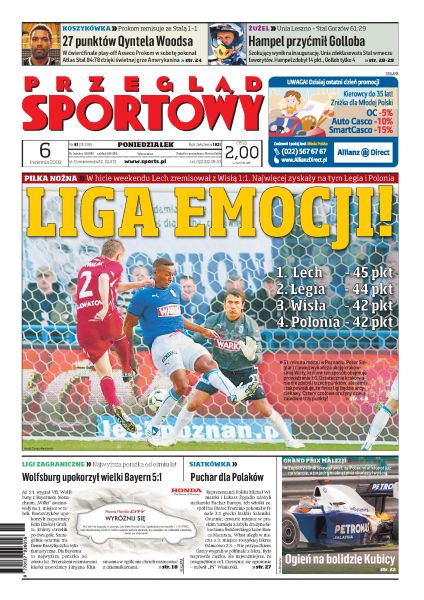 W meczu na szczycie Ekstraklasy Lech Poznań zremisował z Wisłą Kraków 1:1, kto najbardziej skorzystał na takim wyniku; Legia Warszawa pokonała Arkę Gdynia 1:0; polscy sędziowie piłkarscy reprezentują coraz niższy poziom; FC Liverpool awansował na pierwsze miejsce w lidze angielskiej; w kolejnej odsłonie Grand Prix Formuły 1, Robert Kubica znów nie ukończył wyścigu; wywiad z Tomaszem Gollobem; bokserzy Witalij i Władymir Kliczko zdominowali wagę ciężką, czy któryś z nich zdobędzie pas mistrza świata federacji WBA.