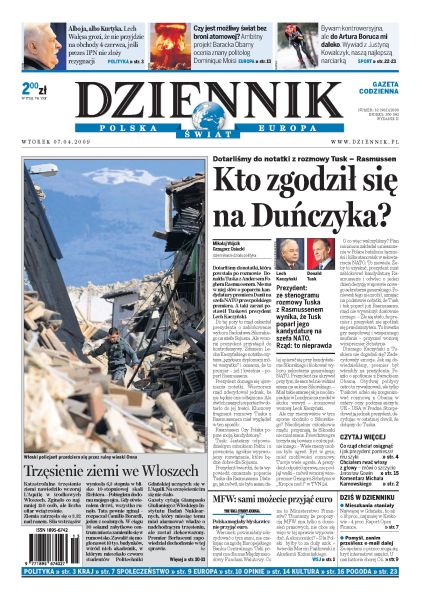 Sto tysięcy ludzi pozbawionych dachu nad głową - to efekt trzęsienia ziemi które nawiedziło okolice włoskiego miasta L'Aquila; Lech Wałęsa zapowiada, że zbojkotuje obchody 20-lecia wyborów 4 czerwca 1989 roku; rynek nieruchomości podnosi się z zapaści, w marcu sprzedano o 20 procent mieszkań więcej niż w lutym; podczas wizyty w Ankarze Barack Obama zapewnił, że Stany Zjednoczone nie prowadzą wojny z islamem; czy istnieją realne szanse na globalne rozbrojenie atomowe.