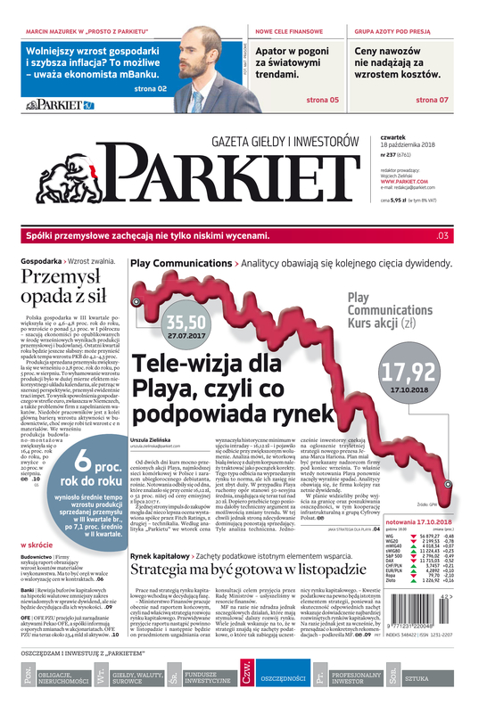 Największy w Polsce newsroom gospodarczy zbiera, analizuje i zgłębia dla Państwa najważniejsze informacje ze świata finansów. Codzienne wydanie „Parkietu”, sześć dni w tygodniu, to kilkadziesiąt artykułów o emitentach, instytucjach finansowych, gospodarce. To również opinie, felietony i wywiady z najważniejszymi ludźmi krajowej i globalnej finansjery.