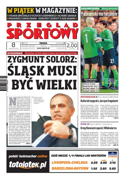 Zygmunt Solorz-Żak zostaje większościowym udziałowcem Śląska Wrocław, remis Cracovii z Polonią Warszawa, dziś kolejne mecze Pucharu Polski, Tomasz Kafarski poprowadzi Lechię Gdańsk, dobry mecz Łukasza Fabiańskiego w ćwierćfinale Ligi Mistrzów, sensacyjny remis w meczu Manchesteru United z FC Porto, Barcelona zagra z Bayernem, Greg Hancock chce odejść z Włókniarza, Pau Gasol opowiada o grze w NBA i o Marcinie Gortarcie.
