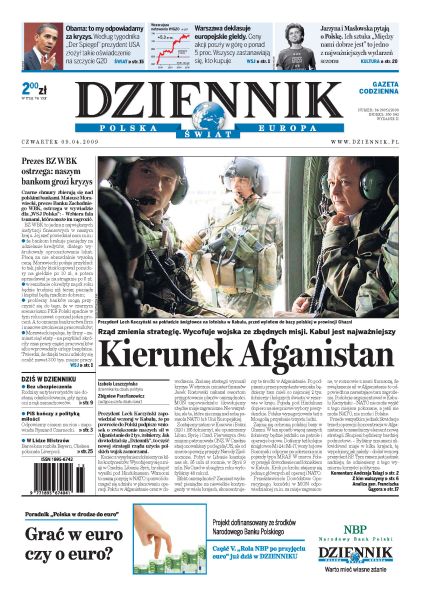Prezydent Lech Kaczyński podczas wizyty w Kabulu zapowiedział, że zwiększy polski kontyngent wojskowy w Afganistanie; przed eurowyborami PiS zmienia swoją politykę względem PO; jak bardzo skurczył się majątek przeciętnej polskiej rodziny w dobie kryzysu; policjanci walczący z terrorystami nie mają ubezpieczeń na życie obejmujących atak zamachowców; mieszkańcy Abruzji żądają pociągnięcia do odpowiedzialności urzędników, którzy zignorowali sygnały o nadchodzącym trzęsieniu ziemi; w Mołdawii narasta konflikt pomiędzy liberalną opozycją a rządzącymi komunistami.
