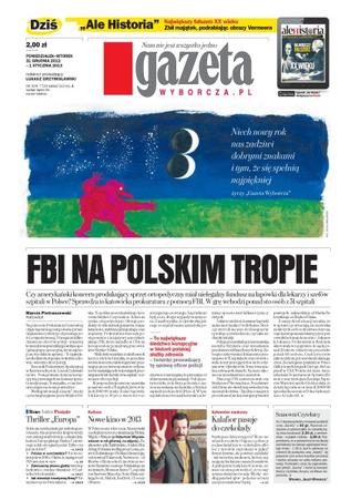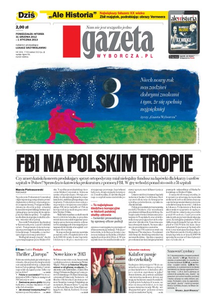 Czy amerykański koncern produkujący sprzęt ortopedyczny miał nielegalny fundusz na łapówki dla lekarzy i szefów szpitali w Polsce – sprawdza to katowicka prokuratura z pomocą FBI; rok temu wielu pisało już nekrologi eurolandu, ale pożar został ugaszony; nowe kino w 2013; Sylwester naukowy – kalafior pasuje do czekolady; jak największy fałszerz XX wieku zbił majątek, podrabiając obrazy Vermeera.