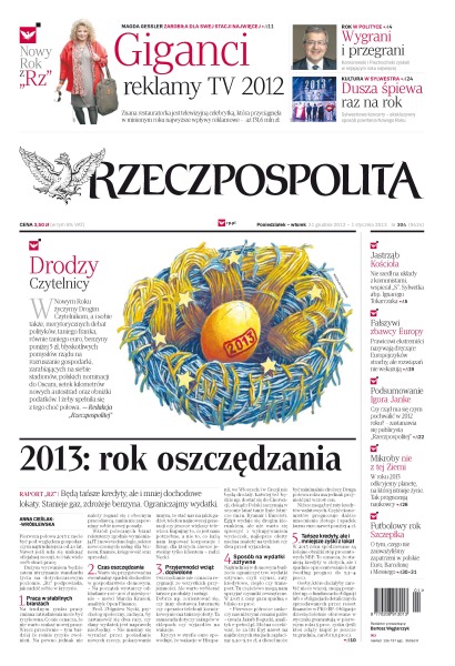 2013: rok oszczędzania – będą tańsze kredyty, ale i mniej dochodowe lokaty, stanieje gaz, zdrożeje benzyna; sylwetka abp. Ignacego Tokarczuka – nie szedł na układy z komunistami, wspierał „S”; prawicowi ekstremiści nazywają dręczące Europejczyków strachy, ale rozwiązań nie wskazują; czy rząd ma się czym pochwalić w 2012 roku; w roku 2013 odkryjemy planetę, na której istnieje życie – tak prognozują naukowcy; o tym, czego nie zauważyliśmy zapatrzeni w polskie Euro, Barcelonę i Messiego.