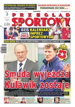 Franciszek Smuda poprowadzi ostatni zespół 2.Bundesligi, SSV Jahn Regensburg; Artur Boruc nie został dobrze oceniony po powrocie do bramki Southampton w meczu z Arsenalem; kalendarz imprez sportowych – pierwsze półrocze 2013; potężna reprezentacja Norwegii będzie gonić samotną Polkę – czy Justyna Kowalczyk obroni przewagę; Agnieszka Radwańska awansowała do ćwierćfinału w Auckland i dziś w nocy walczyła z Jeleną Wiesniną.