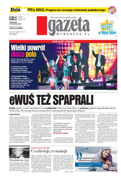 Kandydaci na kierowców spieszą się, by przynajmniej część teoretyczną zdać przed 19 stycznia, bo zmienia się system egzaminowania; jak Ameryce udało się odwlec skok w przepaść; dlaczego chińscy internauci wkrótce stracą anonimowość; w piątek na ekrany amerykańskich kin wchodzi antyłupkowy film „Ziemia obiecana” z Mattem Damonem w roli głównej; wydawcy razem zajmą się e-bookami – zaczęli od utworzenia spółki, która będzie współpracować z internetowymi księgarniami i hurtowniami; dziś etap, który być może rozstrzygnie, czy Justyna Kowalczyk wygra Tour de Ski.