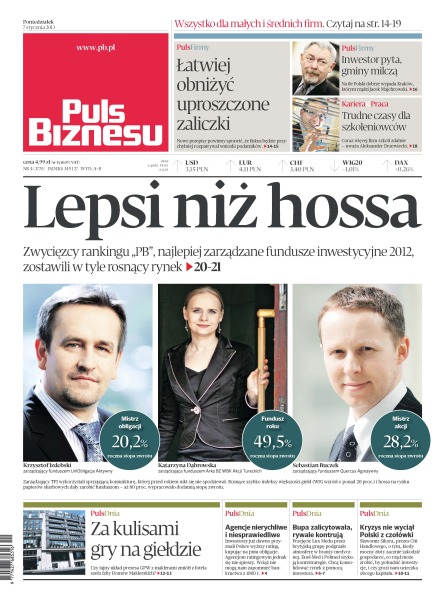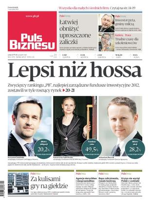 Zwycięzcy rankingu „PB”, najlepiej zarządzane fundusze inwestycyjne 2012, zostawili w tyle rosnący rynek; nowe przepisy powinny sprawić, że fiskus będzie przychylniej rozpatrywał wnioski podatników; czy tajny układ prezesa GPW z maklerami zmiótł z fotela szefa Izby Domów Maklerskich; inwestorzy już dawno przyznali Polsce wyższy rating, kupując na pniu obligacje; przejęcie Lux Medu przez brytyjską grupę podgrzało atmosferę w branży medycznej; Sławomir Sikora, prezes Citi Handlowego, o tym, kiedy mocny złoty zacznie szkodzić gospodarce, co rząd może zrobić, by pobudzić inwestycje, i czy grozi nam ucieczka obcego kapitału.
