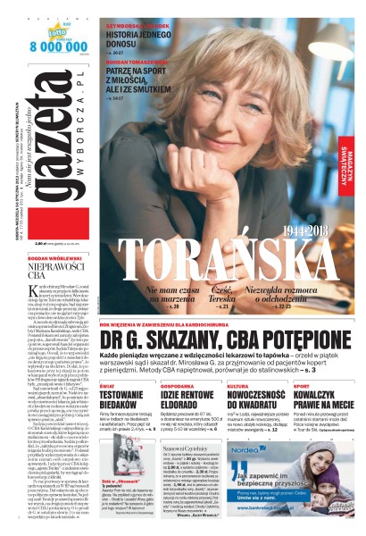 Każde pieniądze wręczane z wdzięczności lekarzowi to łapówka – orzekł w piątek warszawski sąd i skazał dr. Mirosława G.; firmy farmaceutyczne testują leki w Indiach na biedakach i analfabetach; będziesz pracował do 67 lat, a dostaniesz na emeryturze 500 zł mniej niż rencista, który odszedł z pracy 5-10 lat wcześniej; najważniejsze polskie muzeum sztuki nowoczesnej, na nowo ułożyło kolekcję, dodając mistrzów awangardy; Justyna Kowalczyk wyśmienicie radzi sobie w Tour de Ski.