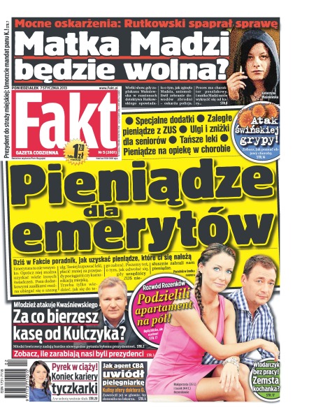 Zarabiają krocie, ale narzekają, że klepią biedę – byli prezydenci mają za nasze dożywotnią ochronę z samochodem i ponad 20 tys. zł na życie co miesiąc, a za wykłady dostają 100 tys. zł; kulisy sprawy Doktora G.; czy matka Madzi będzie wolna przez Rutkowskiego; Aneta z Rumiana pod Działdowem ledwo uszła z życiem, kiedy rzuciła się na nią sfora psów; atak świńskiej grypy – tylko na Śląsku w szpitalach leży 26 osób; Włodarczyk bez pracy – Krawczyk nie załatwił jej roli; nasza królowa nart nie zawiodła i po raz czwarty z rzędu zwyciężyła w Tour de Ski; Justyna Kowalczyk triumfatorką plebiscytu Przeglądu Sportowego i TVP; były mistrz skoków prolog Rajdu Dakar skończył w czołówce.