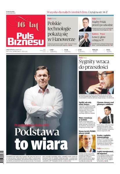 Polska jest partnerem targów CeBIT, branża IT może liczyć na silne promocyjne wsparcie; łowcy głów celują w IT; Janusz Guy marzy o kontraktach w sektorze zdrowia – ruszył wyścig o 1,5 mld zł; spółki odczuły efekt Solara; prokuratura i CBŚ przeczesali gabinet Jacka Kapicy; nowa taryfa PGNiG płoszy rywali; koniec zagłębia telewizyjnego; dlaczego lepiej wynajmować, niż kupować.