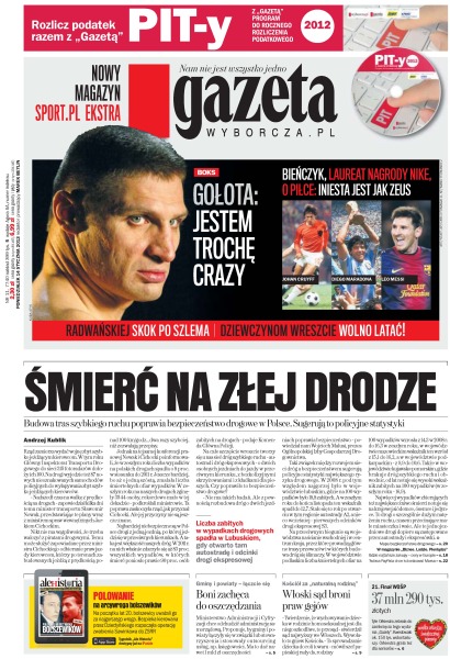 Budowa tras szybkiego ruchu poprawia bezpieczeństwo drogowe w Polsce – sugerują to policyjne statystyki; gminy i powiaty łączcie się – Boni zachęca do oszczędzania; włoski sąd broni praw gejów; 21. Finał WOŚP – 37 mln 290 tys. Złotych; przemysł zbrojeniowy powinien stać się jedną z lokomotyw gospodarki; co roku myśliwi zabijają około 140 tys. ptaków – jedna czwarta to gatunki chronione.