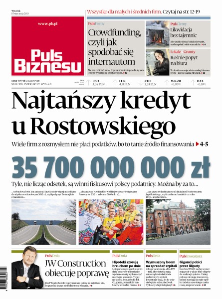 Najtańszy kredytu Rostowskiego – wiele firm z rozmysłem nie płaci podatków, bo to tanie źródło finansowania; Józef Wojciechowski z optymizmem patrzy na najbliższe lata, bo przecież kryzys nie będzie trwał wiecznie; hipoteki szorują brzuchem po dnie; wymuszony boom na sprzedaż szpitali; korekta WIG20 zachęca inwestujących w akcje blue chipów do realizacji zysków, takiej pokusy nie mają inwestorzy, którzy stawiają na małe spółki.