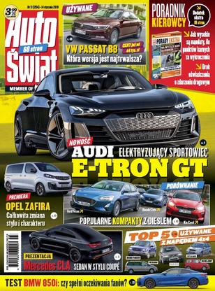 Audi e-tron GT – jazda prototypowym e-sportowcem; Mercedes CLA – druga generacja czterodrzwiowego coupé; Opel Zafira Life – prezentacja nowego 9-osobowego vana; Ford Focus, Honda Civic i Kia Ceed – porównanie kompaktów w wersjach z silnikami wysokoprężnymi; Volkswagen Amarok – pikap z mocnym dieslem V6; BMW 850i – nowa seria 8 – luksusowe coupé z V8 biturbo; Land Rover Discovery – duży SUV z 240-konnym 4-cylindrowym dieslem; mechanicy samochodowi – jak ustrzec się oszustwa w warsztacie.