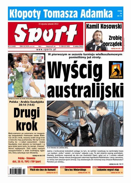 W pierwszym w sezonie turnieju wielkoszlemowym ponieśliśmy już straty; kolizja Adamka – podczas skrętu na skrzyżowaniu „Góral” nie utrzymał się na jezdni, uderzając w zaparkowane samochody; Polska - Arabia Saudyjska 28:14 – biało-czerwoni zrobili drugi krok w kierunku fazy pucharowej; Łukasz Łaskawiec okazał się najszybszym quadowcem na etapie Dakaru; „właśnie spełniam jedno z dwóch swoich sportowych marzeń, które mi zostały” - zdradza Kamil Kosowski.