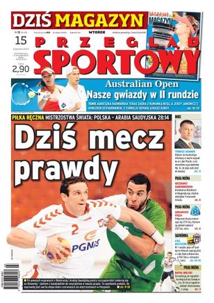 Po pewnych wygranych z Białorusią i Arabią Saudyjską polscy szczypiorniści zmierzą się dziś ze Słowenią; z trójki Polaków walczących pierwszego dnia Wielkiego Szlema w Melbourne straciliśmy Łukasza Kubota; Tomasz Adamek nie komentuje informacji o swym wypadku w Lake Placid; bramkarza Blackburn w Regensburgu chętnie widziałby Franciszek Smuda; w I rundzie play-off siatkarze Resovii zagrają dziś z Lube Banca Macerata, a PGE Skra z Arkasem Izmir.