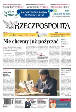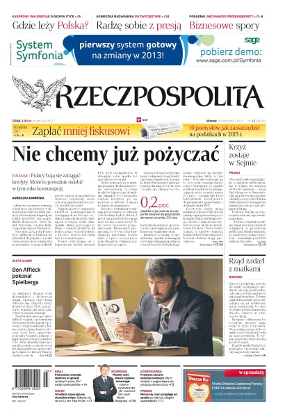 Polacy boją się zaciągać kredyty, może to poważnie osłabić w tym roku konsumpcję; jak zapłacić mniej fiskusowi; rząd zadarł z matkami; obecność symbolu religijnego w miejscu publicznym, np. w Sejmie, nie narusza swobody sumienia – uznał Sąd Okręgowy w Warszawie; prokuratura wszczęła śledztwo w sprawie opisanych przez ”Rz” badań sześciolatków; w Indiach rozpoczęło się niezwykłe święto, odbywa się raz na 12 lat i trwa 55 dni; Ben Affleck pokonał Spielberga.
