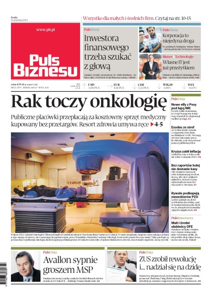 Rak toczy onkologię – publiczne placówki przepłacają za kosztowny sprzęt medyczny kupowany bez przetargów; zamiast wysyłać prezentacje do wielu funduszy, wybierz takie, w których twoja firma ma szansę; nowe elfy z Pesy pod lupą NIK; aż 30 firm złożyło wnioski o wygaszenie zezwolenia na działalność w SSE; bez raportów kolej nie dostanie kasy; rywale podkupują menedżerów PZU.