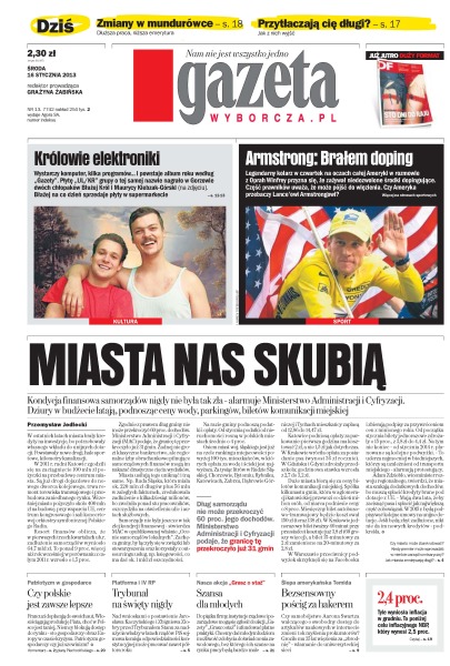 Kondycja finansowa samorządów nigdy nie była tak zła – alarmuje Ministerstwo Administracji i Cyfryzacji; zmiany w mundurówce – dłuższa praca, niższa emerytura; przytłaczają cię długi – zobacz jak z nich wyjść; patriotyzm w gospodarce – czy polskie jest zawsze lepsze; ślepa amerykańska Temida – bezsensowny pościg za hakerem; Armstrong: „brałem doping”.