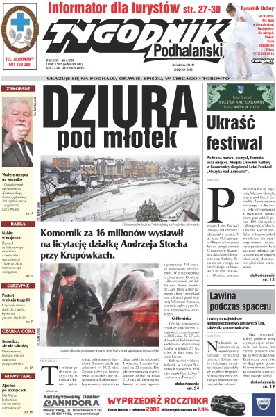 Komornik za 16 milionów zł wystawił na licytację działkę Andrzeja Stocha przy Krupówkach; czy w Skrzypnem musi znowu dojść do tragedii, by we wsi powstał chodnik; na nowotarskim Rynku nie ma miejsc dla niepełnosprawnych – choć urzędnicy twierdzą, że są; oczyszczalnia ścieków w Czarnej Górze pracuje na granicy przepustowości; w Poroninie brakuje miejsc w nowym przedszkolu Sióstr Michalitek.