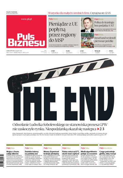 Odwołanie Ludwika Sobolewskiego ze stanowiska prezesa GPW nie zaskoczyło rynku, niespodzianką okazał się następca; pieniądze z UE popłyną przez regiony do MSP; polisa do leasingu bez podatku VAT; wojna o Seata zabija dilerów; duńskie kokosy na polskiej wsi; Money Expertowi brakuje pieniędzy; fiskus zniszczył JTT, skarb musi zapłacić; Medicalgorithmics poluje za oceanem.