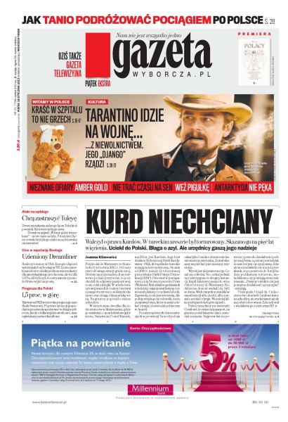 Walczył oprawa Kurdów, w tureckim areszcie był torturowany, skazano go na pięć lat więzienia – uciekł do Polski, ale urzędnicy gaszą jego nadzieje; jak tanio podróżować pociągiem po Polsce; chcą zastraszyć Tuleyę – drzwi mieszkania sędziego Igora Tulei ktoś pomazał, ktoś wytropił jego syna; nadzory lotnicze w USA, Europie i Japonii wstrzymały loty boeingów 787; 1,5 proc. w górę – taki wzrost PKB w tym roku prognozuje nam Bank Światowy; Tarantino idzie na wojnę... z niewolnictwem.