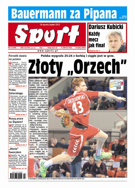 Polska wygrała 25:24 z Serbią i ciągle jest w grze; Waldemar Fornalik ogłosił wczoraj 18-osobową kadrę, która 2 lutego spotka się w Maladze w towarzyskim meczu z Rumunią; z Górnikiem trenuje już Tomasz Zahorski, który jutro powinien zagrać w sparingu z KS Polkowi-ce; wiele wskazuje na to, że ślimaczący się remont Stadionu Śląskie-go doczeka się wreszcie końca; Republika Południowej Afryki jest gospodarzem 29. turnieju o Puchar Narodów Afryki – faworytem do mistrzostwa jest Wybrzeże Kości Słoniowej.