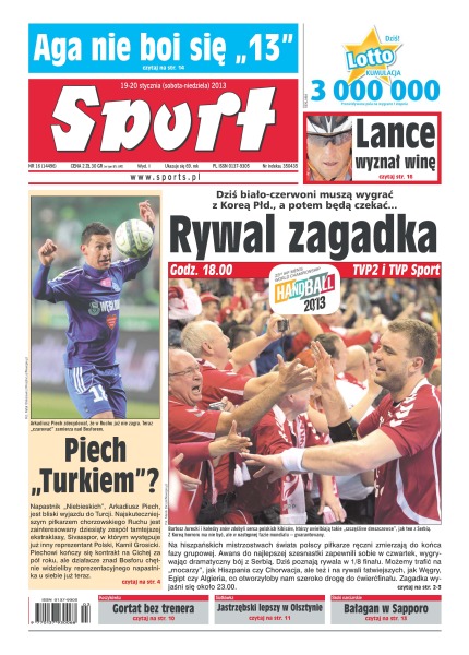 Na hiszpańskich mistrzostwach świata polscy piłkarze ręczni zmierzają do końca fazy grupowej – awans do najlepszej szesnastki zapewnili sobie w czwartek, wygrywając dramatyczny bój z Serbią; dakarową karawanę dzieli już tylko 630 km od celu w Santiago; zawodnicy Jastrzębskiego Węgla musieli się sporo napracować w Olsztynie, by wrócić do domu z kompletem punktów; kapryśna aura oraz awaria aparatury elektronicznej pokrzyżowały wczoraj plany skoczkom na Okurayamie, a kwalifikacje okazały się zbędne; o ćwierćfinał Agnieszka Radwańska zawalczy w nocy z soboty na niedzielę w swoim 13. meczu w roku z rozstawioną z „13” Aną Ivanović; zgodnie z przewidywaniami, Lance Armstrong