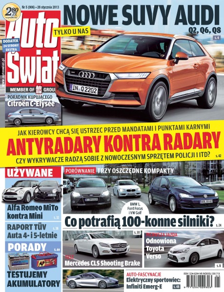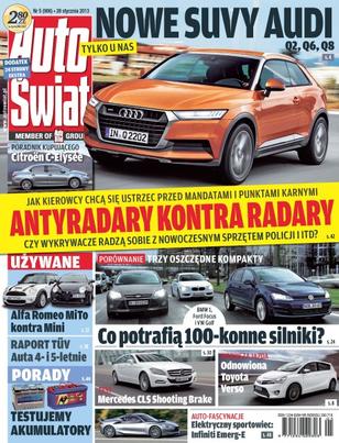 Prezentacja, jazdy testowe, aktualności: Audi Q2, Q6 oraz Q8, Toyota Verso, Range Rover TDV6; sprzedaż aut osobowych w Polsce w 2012 roku; sport: podsumowanie startu polskich załóg w Rajdzie Dakar; poradnik kupującego: Citroën C-Elysée – nadwozie, wnętrze i felgi, bezpieczeństwo, systemy elektroniczne, wyposażenie, zawieszenie, silniki, ceny; testy i porównania: VW Golf kontra Ford Focus i BMW serii 1, Mercedes CLS Shooting Brake; używane: Alfa Romeo MiTo kontra Mini, raport TÜV 2013 – część 2.; porady: test 10 modeli akumulatorów, antyradary; auto-fascynacje: Oldsmobile Toronado, Infiniti Emerg-E.
