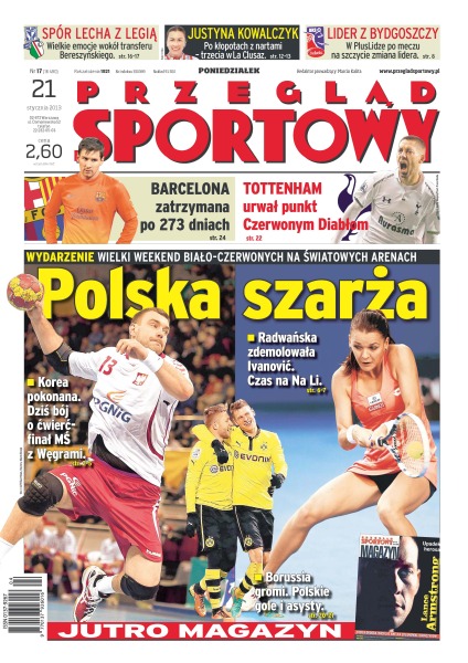 Polska szarża – wielki weekend Biało-czerwonych na światowych arenach; Korea pokonana – dziś bój o ćwierćfinał Mistrzostw Świata z Węgrami w piłkę ręczną; Agnieszka Radwańska zdemolowała Ivanovic – czas na Na Li; Borussia Dortmund gromi – polskie gole i asysty; Barcelona zatrzymana po 273 dniach; Tottenham urwał punkt Czerwonym Diabłom; Justyna Kowalczyk po kłopotach z nartami była trzecia w La Clusaz; spór Lecha z Legią – wielkie emocje wokół transferu Bereszyńskiego; Lider z Bydgoszczy – w PlusLidze po meczu na szczycie zmiana lidera.