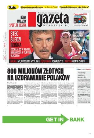 800 milionów złotych na uzdrawianie Polaków – ściślej, na profilaktykę i leczenie chorób cywilizacyjnych; kto dostanie nagrodę roczną; 150 rocznica wybuchu powstania styczniowego; Agnieszka Radwańska pochłania energię; Justyna Kowalczyk i jej tępe narty; bezrobocie w Ameryce Południowej i Środkowej spadło do 6,4 procenta; bez jednolitego patentu osuniemy się w technologiczną dziurę; Chinlandia – państwo Środka zabiega o względy 57 tys. Grenlandczyków – chodzi o złoża metali ziem rzadkich.