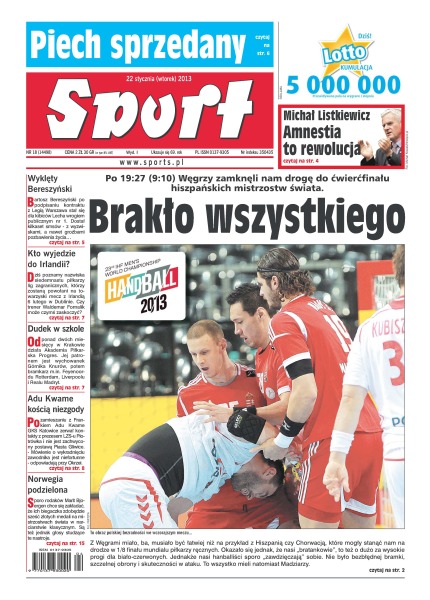 Brakło wszystkiego – po 19-27 (9-10) Węgrzy zamknęli nam drogę do ćwierćfinału hiszpańskich mistrzostw świata; wyklęty Bereszyński – Bartosz Bereszyński po podpisaniu kontraktu z Legią Warszawa stał się dla kibiców Lecha wrogiem publicznym numer jeden; kto wyjedzie do Irlandii – dziś poznamy nazwiska siedemnastu piłkarzy lig zagranicznych, którzy zostaną powołani na towarzyski mecz z Irlandią; Dudek w szkole – od ponad dwóch miesięcy w Krakowie działa Akademia Piłkarska Progres; Adu Kwame kością niezgody – po zamieszaniu z Frankiem Adu Kwame GKS Katowice zerwał kontakty z prezesem LZS-u Piotrówka i nie jest zachwycony postawą Piasta Gliwice.