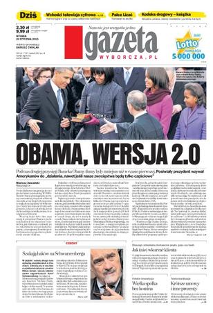 Obama, wersja 2.0 – podczas drugiej przysięgi Baracka Obamy tłumy były mniejsze niż w czasie pierwszej – posiwiały prezydent wzywał Amerykanów do „działania, nawet jeśli nasze zwycięstwa będą tylko częściowe”; jak (nie) wkurzać klienta – dlaczego zmieniamy dostawców prądu, gazu czy bank; szukają haków na Schwarzenberga – w piątek i sobotę druga tura wyborów prezydenckich w Czechach; krótsze umowy i inne prezenty – od wczoraj obowiązuje nowe prawo telekomunikacyjne; wchodzi telewizja cyfrowa – harmonogram oraz co czeka odbiorców kablówek.
