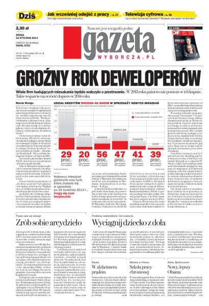 Groźny rok deweloperów – wiele firm budujących mieszkania będzie walczyło o przetrwanie – w 2013 roku państwo nie pomoże w ich kupnie – takie wsparcie ma wrócić dopiero w 2014 roku; wyciągnij dziecko z doła – problemy nastolatków i ich rodziców; jak wcześniej odejść z pracy – dla kogo wcześniejsze emerytury; telewizja cyfrowa – czy musisz wymieniać telewizor lub wydawać pieniądze na dekoder; w alzheimera prądem – nowatorska metoda leczenia choroby Alzheimera; nowy, lepszy Obama – umarł Obama przesadnie koncyliacyjny wobec prawicowych matołków.
