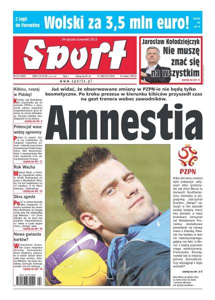 Amnestia – już widać, że obserwowane zmiany w PZPN-ie nie będą tylko kosmetyczne – po kroku prezesa w kierunku kibiców przyszedł czas na gest trenera wobec zawodników; z Legii do Fiorentiny – Wolski za 3,5 miliona euro; „Nie muszę się znać na wszystkim” – Jarosław Kołodziejczyk; Komisja Ligi Ekstraklasy SA przychyliła się do wniosku PZPN-u o darowanie zakazu wyjazdów zorganizowanych grup kibiców na mecze ekstraklasy; Mariusz Wach, w którego organizmie wykryto środki dopingujące po walce z Władimirem Kliczką, ma być zawieszony na 12 miesięcy.