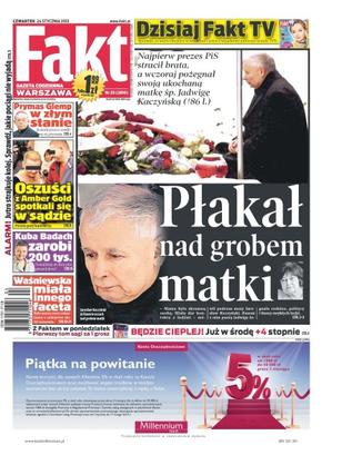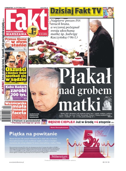 Jarosław Kaczyński ze łzami w oczach nad grobem matki – najpierw prezes PiS stracił brata, a wczoraj pożegnał swoją ukochaną matkę śp. Jadwigę Kaczyńską; oszuści z Amber Gold spotkali się w sądzie – proces pary kanciarzy; Kuba Badach zarobi 200 tysięcy; Waśniewska miała innego faceta – były narzeczony oskarżonej o zabójstwo złożył zeznania; Prymas Glemp nie żyje – hierarchia odszedł wczoraj wieczorem po długiej i ciężkiej chorobie.