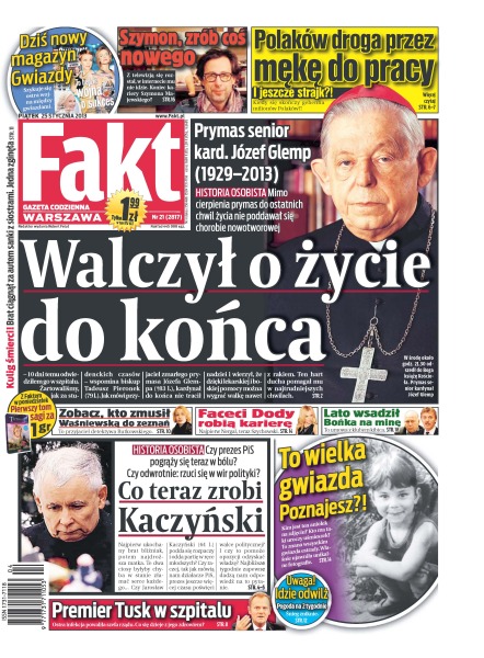 Prymas senior kardynał Józef Glemp (1929-2013) – walczył o życie do końca; co teraz zrobi Kaczyński – czy prezes PiS pogrąży się teraz w bólu, czy odwrotnie – rzuci się w wir polityki; premier Tusk w szpitalu – ostra infekcja powaliła szefa rządu, co się dzieje z jego zdrowiem; faceci Dody robią karierę – najpierw Nergal, teraz Szychowski; zobacz, kto zmusił Waśniewską do zeznań – to przyjaciel detektywa Rutkowskiego; Lato wsadził Bońka na minę – to umowa z klubem kibica; Polaków droga przez mękę do pracy – kiedy się skończy gehenna milionów Polaków.