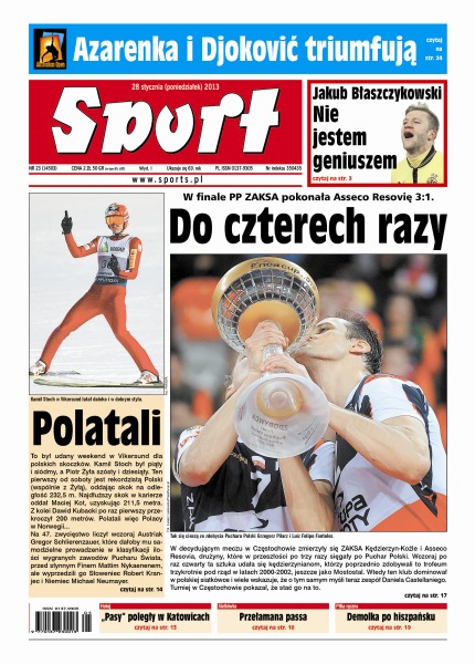 W finale PP ZAKSA pokonała Asseco Resovię 3:1; Borussia nawet w dwóch poprzednich sezonach tak dobrze nie zaczęła roku; Napoli zdobyło stadion Tardini i zyskało najwięcej w tej kolejce; Cristiano Ronaldo w ciągu 10 minut uzyskał hat tricka; Wybrzeże Kości Słoniowej, bez Didiera Drogby, udowodniło w końcu swe mistrzowskie aspiracje; Dominik Paris najszybszy na legendarnej trasie biegu zjazdowego w Kitzbuehel – Maciej Bydliński dziewiąty w kombinacji; po koncertowej grze Hiszpanie przełamali niemoc w starciach