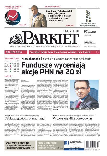 Fundusze nie chcą płacić za akcje PHN więcej niż 20 zł; trudno sprywatyzować Energę bez nowych przepisów o OZE; UOKiK sprawdza umowy PGNiG; Lentex chce sprzedać pakiet w Plast-Boksie; ustawa deregulacyjna zniechęca do zdawania egzaminu na maklera i doradcę inwestycyjnego; skandal w sieneńskim banku nie tylko wpłynie na wybory, ale rzuca też cień podejrzeń na szefa EBC.